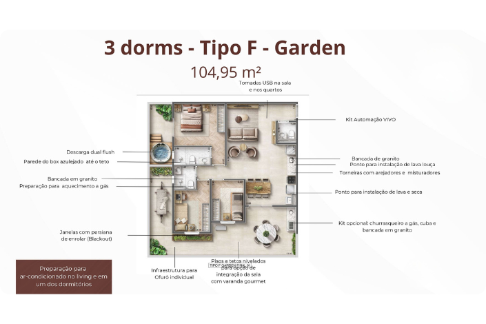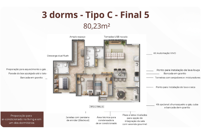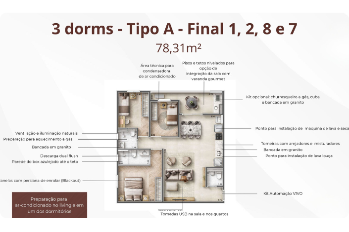 3 dormitórios, suíte, varanda gourmet integrada, excelente aproveitamento dos ambientes e circulação otimizada. Entregue com preparação para ar-condicionado, bancadas em granito, persianas blackout e kit automação. Uma planta funcional sem abrir mão do padrão premium.